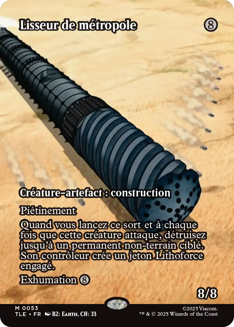 Quand vous lancez ce sort et à chaque fois que le Lisseur de métropole attaque, détruisez jusqu'à un permanent non-terrain ciblé. Son contrôleur crée un jeton Lithoforce engagé.