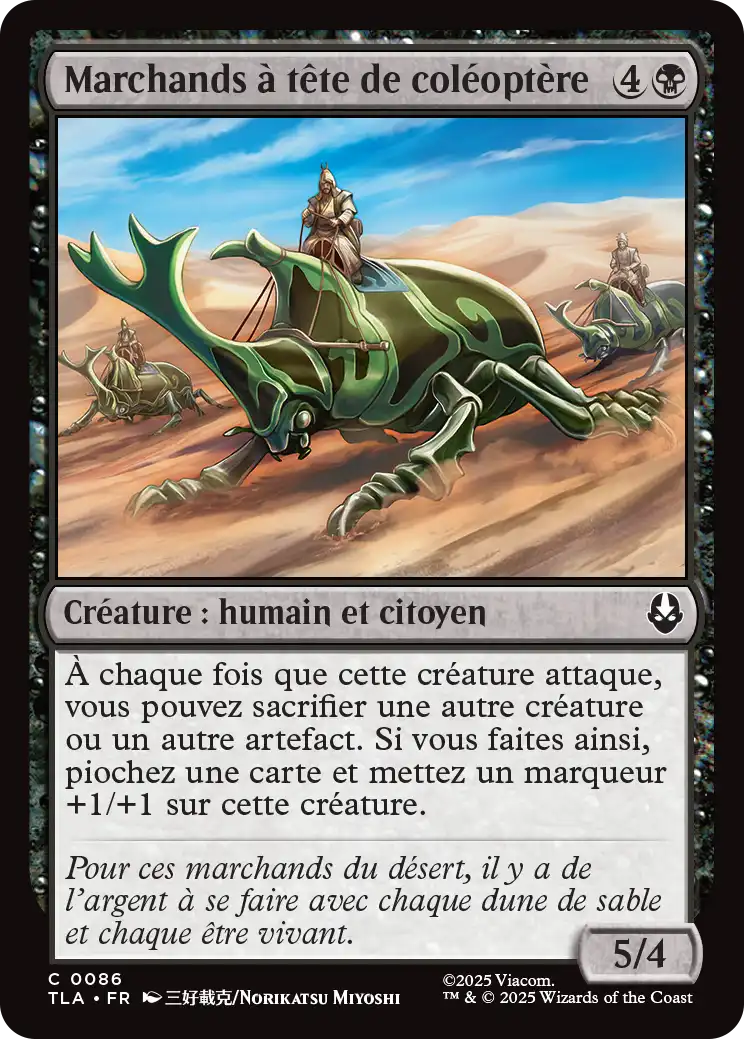 À chaque fois que cette créature attaque, vous pouvez sacrifier une autre créature ou un autre artefact. Si vous faites ainsi, piochez une carte et mettez un marqueur +1/+1 sur cette créature.