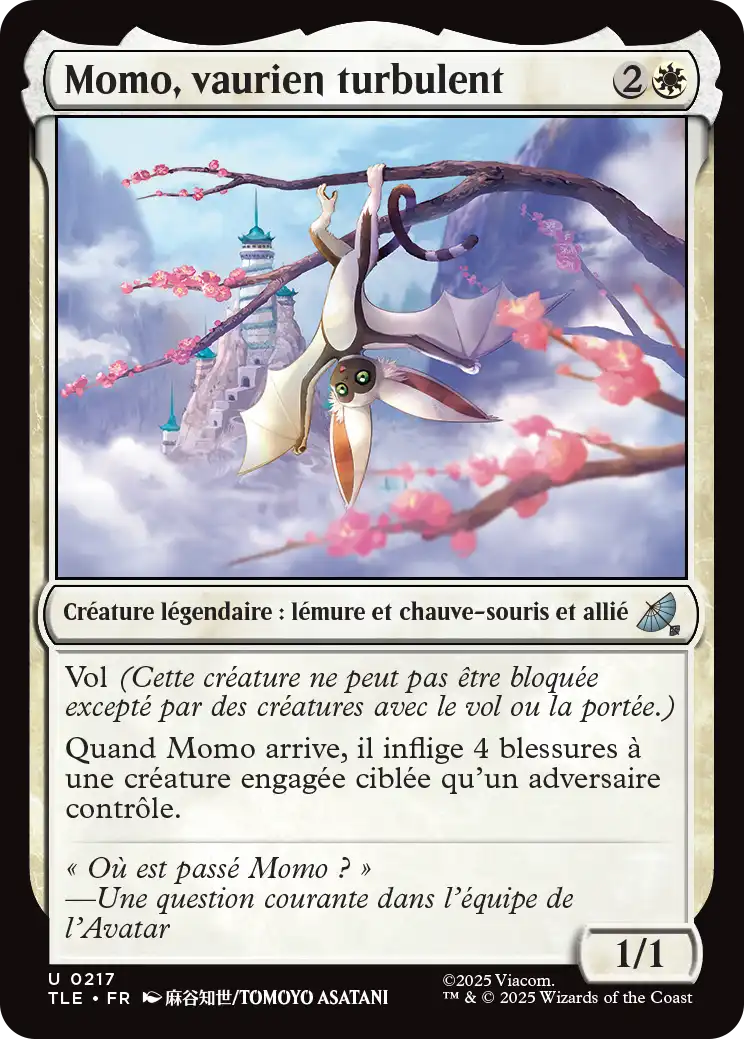 Quand Momo arrive, il inflige 4 blessures à une créature engagée ciblée qu'un adversaire contrôle.