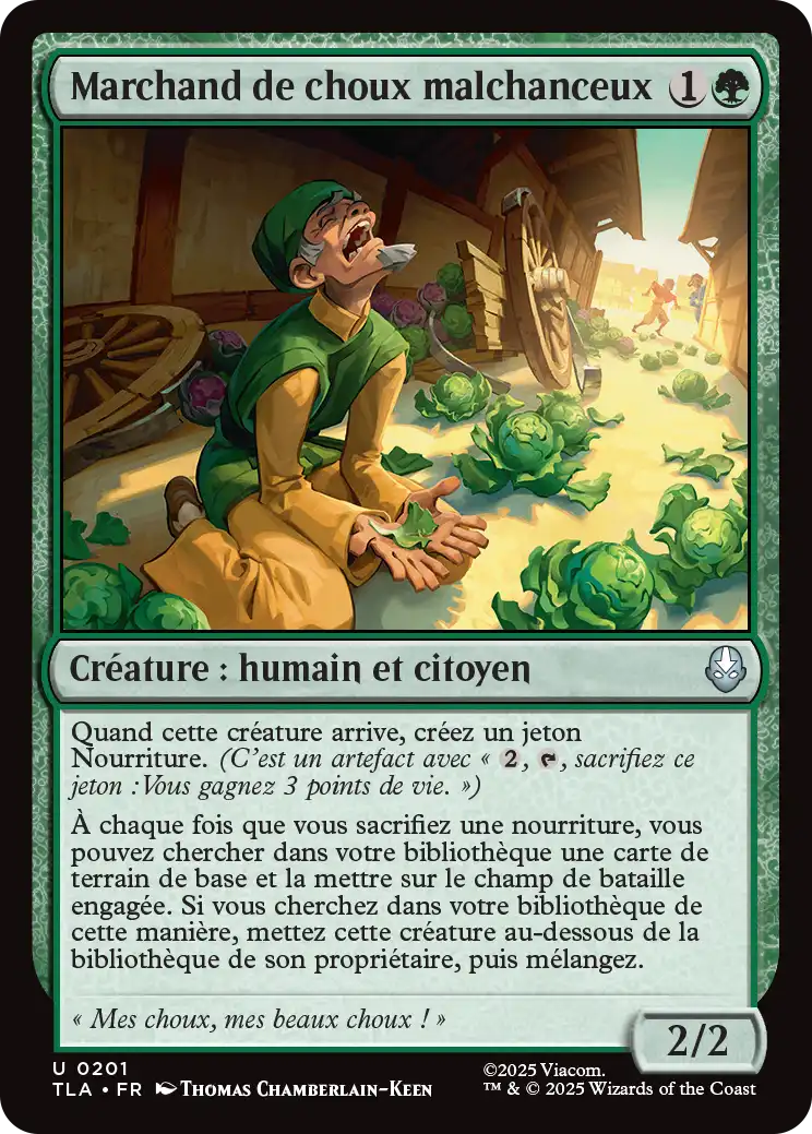 À chaque fois que vous sacrifiez une nourriture, vous pouvez chercher dans votre bibliothèque une carte de terrain de base et la mettre sur le champ de bataille engagée. Si vous cherchez dans votre bibliothèque de cette manière, mettez cette créature au-dessous de la bibliothèque de son propriétaire, puis mélangez.