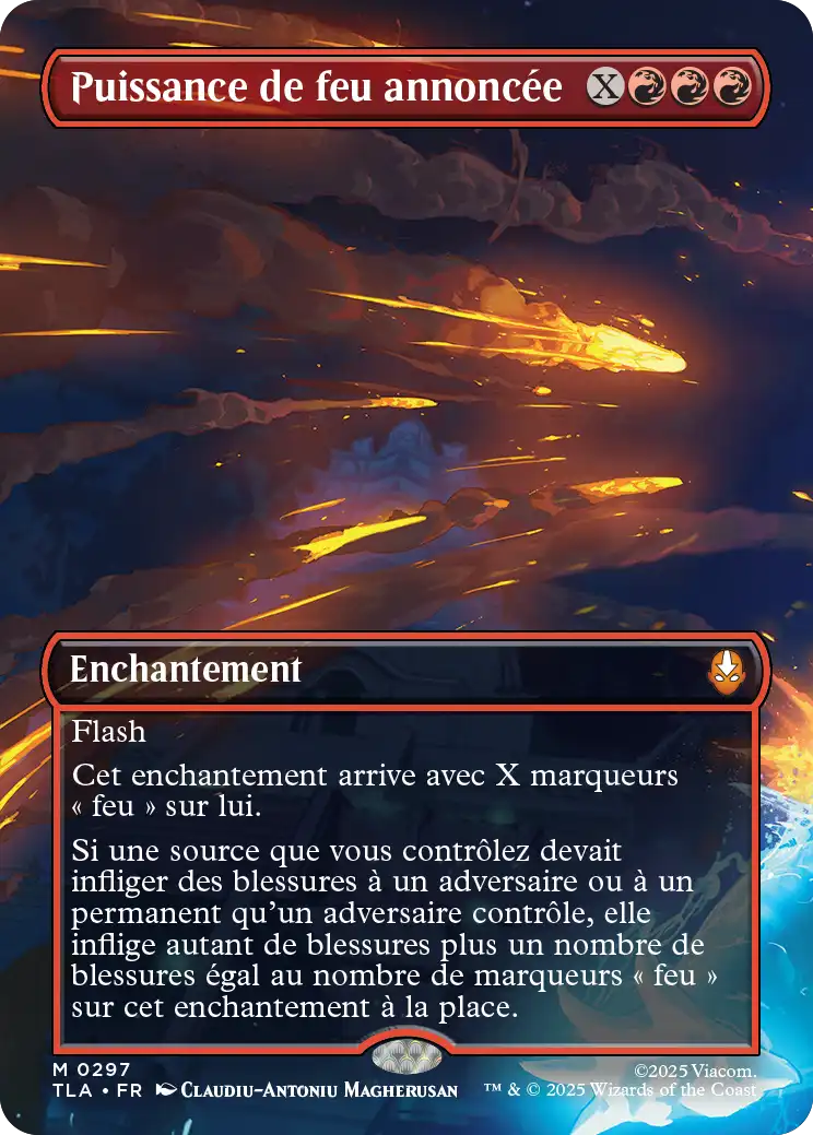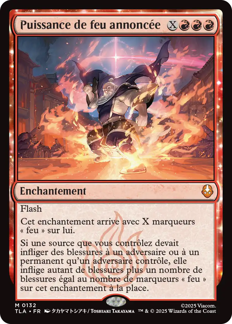 Si une source que vous contrôlez devait infliger des blessures à un adversaire ou à un permanent qu'un adversaire contrôle, elle inflige autant de blessures plus un nombre de blessures égal au nombre de marqueurs "feu" sur cet enchantement à la place.