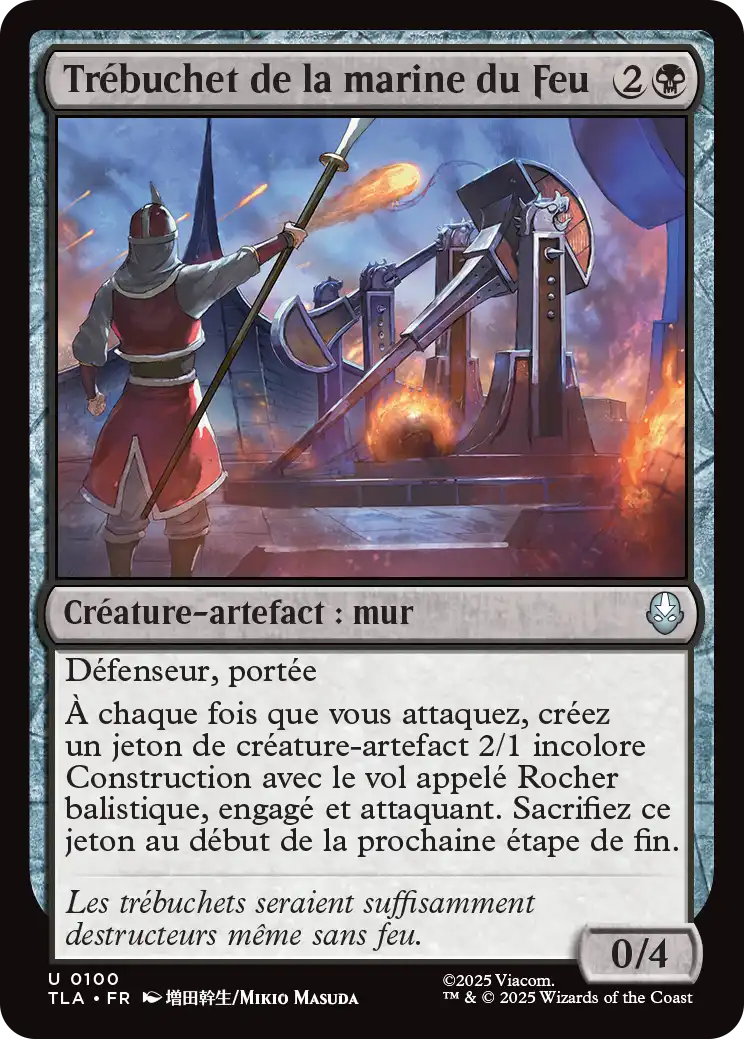 À chaque fois que vous attaquez, créez un jeton de créature-artefact 2/1 incolore Construction avec le vol (Cette créature ne peut être bloquée que par des créatures avec le vol ou la portée.) appelée Rocher balistique, engagé et attaquant. Sacrifiez ce jeton au début de la prochaine étape de fin.