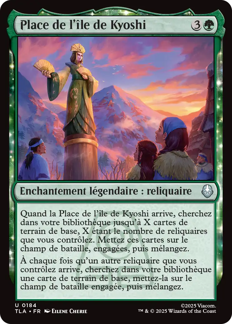 Quand la Place de l'île de Kyoshi arrive, cherchez dans votre bibliothèque jusqu'à X cartes de terrain de base, X étant le nombre de reliquaires que vous contrôlez. Mettez ces cartes sur le champ de bataille, engagées, puis mélangez.