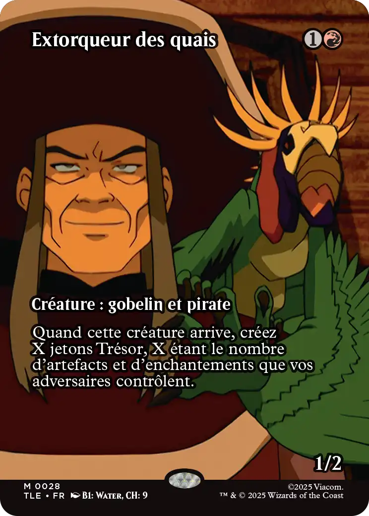 Quand l'Extorqueur des quais arrive sur le champ de bataille, créez X jetons Trésor, X étant le nombre d'artefacts et d'enchantements que vos adversaires contrôlent.