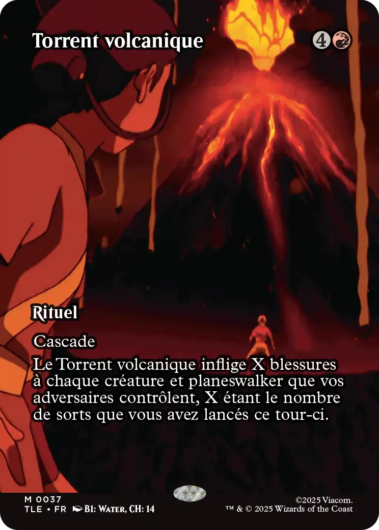 Le Torrent volcanique inflige X blessures à chaque créature et planeswalker que vos adversaires contrôlent, X étant le nombre de sorts que vous avez lancés ce tour-ci.