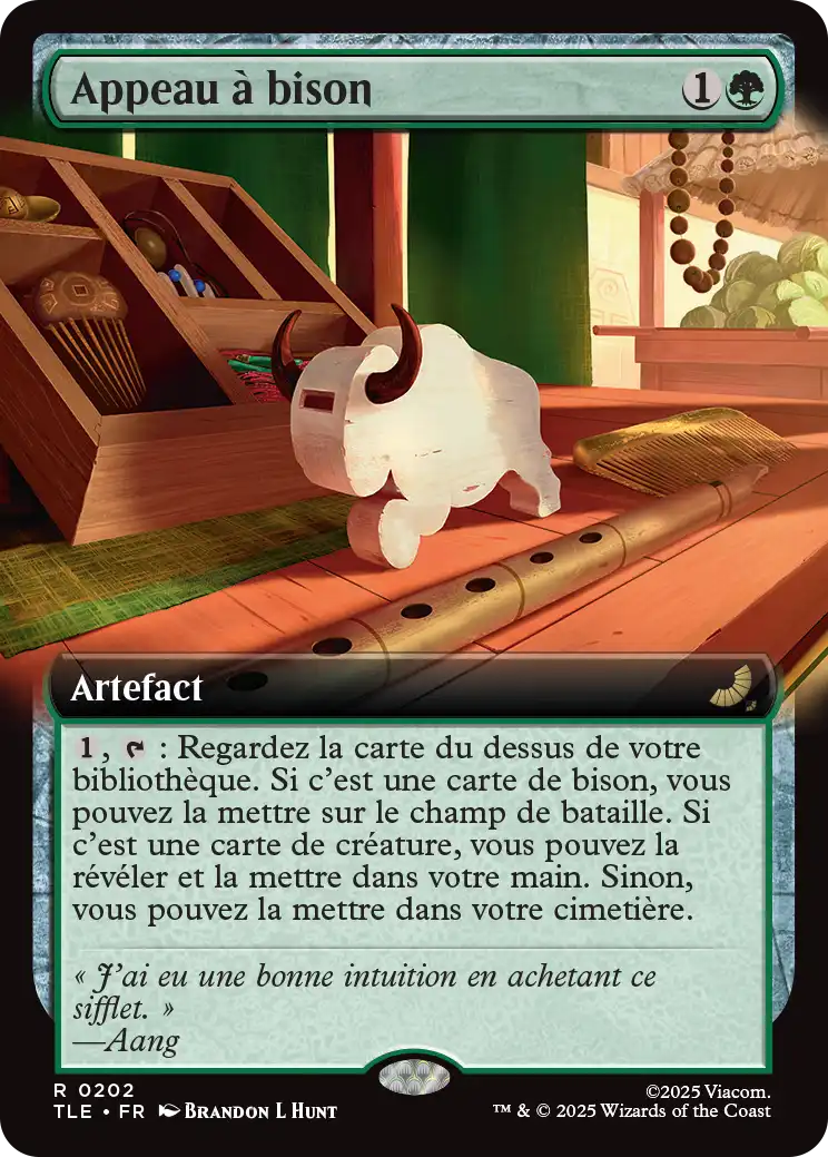 : Regardez la carte du dessus de votre bibliothèque. Si c'est une carte de bison, vous pouvez la mettre sur le champ de bataille. Si c'est une carte de créature, vous pouvez la révéler et la mettre dans votre main. Sinon, vous pouvez la mettre dans votre cimetière.