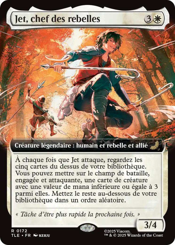 Whenever Jet attacks, look at the top five cards of your library. You may put a creature card with mana value 3 or less from among them onto the battlefield tapped and attacking. Put the rest on the bottom of your library in a random order.