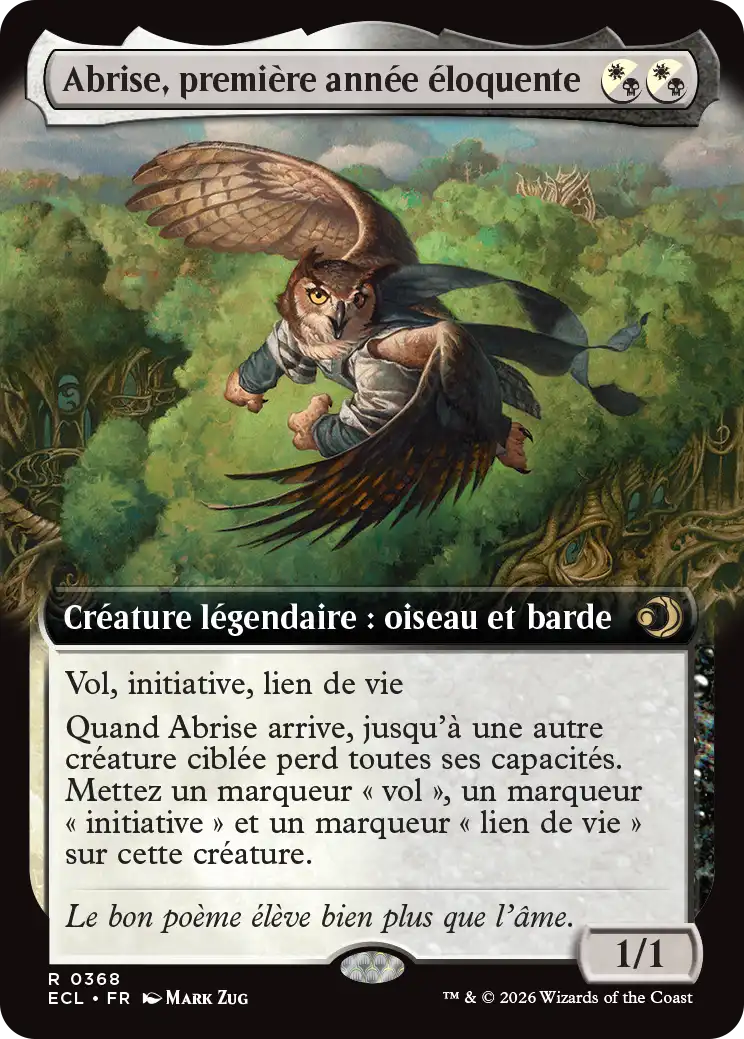 Quand Abrise arrive, jusqu'à une autre créature ciblée perd toutes ses capacités. Mettez un marqueur "vol (Cette créature ne peut être bloquée que par des créatures avec le vol ou la portée.)", un marqueur "intitiative" et un marqueur "lien de vie (Les blessures infligées par la créature font aussi gagner autant de points de vie à son contrôleur.)" sur cette créature.