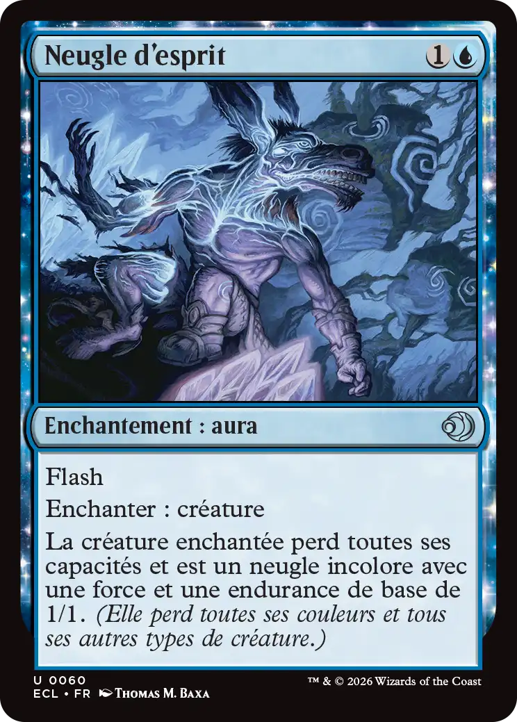 La créature enchantée perd toutes ses capacités et est un neugle incolore avec une force et une endurance de base de 1/1. (Elle perd toutes ses couleurs et tous ses autres types de créature.)