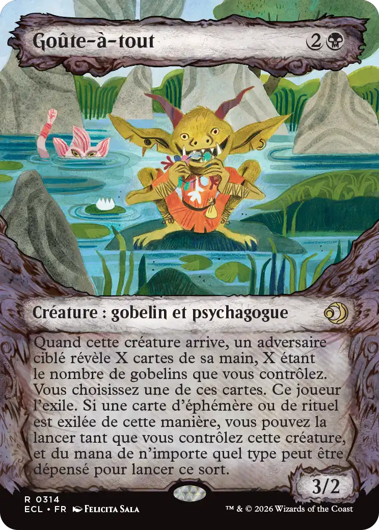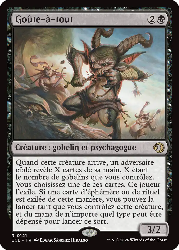 Quand cette créature arrive, un adversaire ciblé révèle X cartes de sa main, X étant le nombre de gobelins que vous contrôlez. Vous choisissez une de ces cartes. Ce joueur l'exile. Si une carte d'éphémère ou de rituel est exilée de cette manière, vous pouvez la lancer tant que vous contrôlez cette créature, et du mana de n'importe quel type peut être dépensé pour lancer ce sort.
