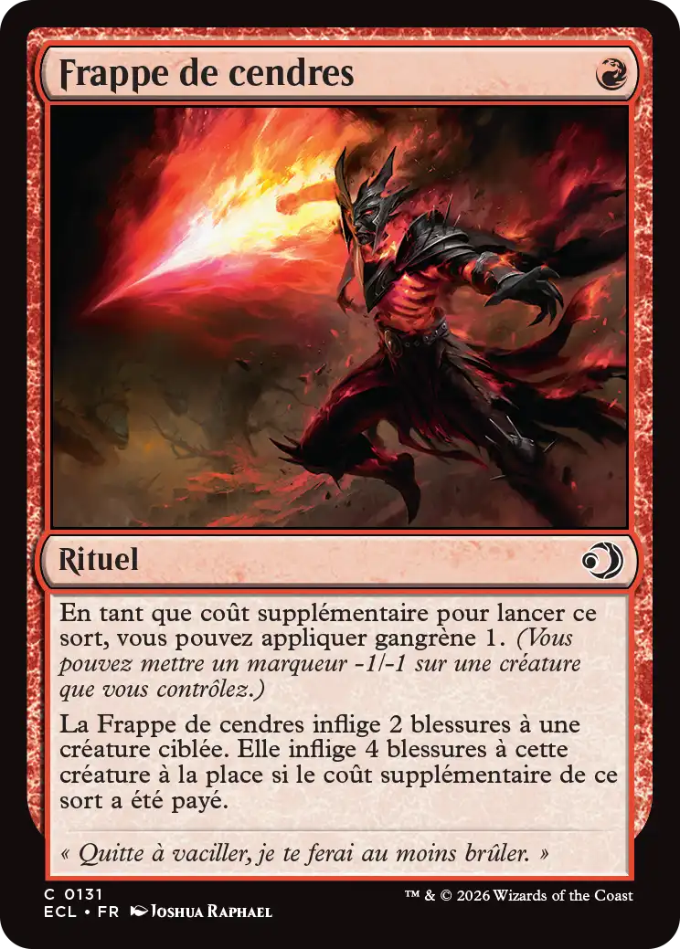 La Frappe de cendres inflige 2 blessures à une créature ciblée. Elle inflige 4 blessures à cette créature à la place si le coût supplémentaire de ce sort a été payé.
