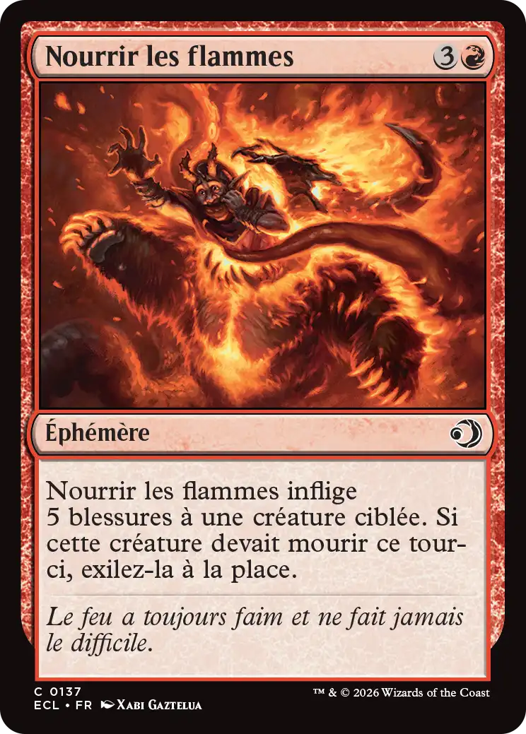 Nourrir les flammes inflige 5 blessures à une créature ciblée. Si cette créature devait mourir ce tour-ci, exilez-la à la place.