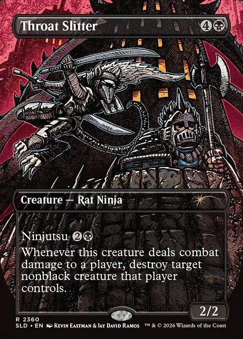 , renvoyez en main un attaquant non-bloqué que vous contrôlez : Mettez sur le champ de bataille cette carte, engagée et attaquante, depuis votre main.)À chaque fois que le Tranche-gorge inflige des blessures de combat à un joueur, détruisez la créature non-noire ciblée que ce joueur contrôle.