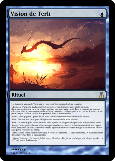 , mais il faut la jouer avant d'avoir deux terrains. Pourquoi ? Parce que c'est un moyen simple pour vous faire jouer la carte vite, donc sans trop connaître le deck de votre adversaire (si vous le connaissiez déjà, je peux rien faire), et d'avantager ceux qui n'ont pas de terrains (On connait tous cette malédiction). Ensuite vous choisissez n'importe quel nombre de couleurs (0 si vous voulez mais ça sert absolument à rien !) susceptibles d'être dans la main de ce joueur. Si elles y sont, vous gagnez des bonus différents en fonction des couleurs choisies. Petite erreur, mais que je ne corrige pas parce que ce n'est pas grave : Vous gagnez quand même votre bonus si vous avez choisi des bonnes et des mauvaises couleurs. Mais vous perdez quand même des points de vie, je suppose que ça suffira pour dissuader. Au début je voulais la faire pour