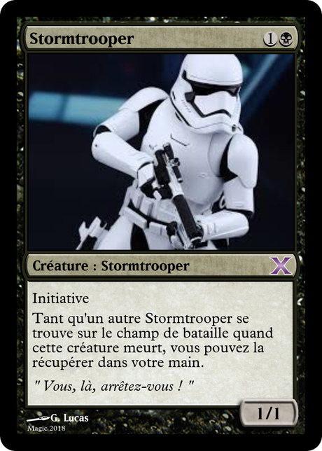 Après le succès incontestable de mon deck Homme-rat (pas vraiment, en fait), j'ai décidé de créer un deck noir Star Wars sur l'Empire, car c'est mon film de science-fiction préféré. Mais attention, seulement l'épisode 4,5 et 6. Les autres, bof... Mon deck est fini depuis longtemps maintenant, il est imprimé, collé, il a disputé ses premières parties, et s'en sort plutôt bien. Voici donc la créature de base de ce deck, le Stormtrooper. C'est une 1/1 pour , mais elle possède, comme tous les Stormtroopers, l'initiative, et lorsqu'elle meurt, elle peut revenir dans votre main à la place, à condition que vous contrôliez une autre créature de type Stormtrooper. Très pratique, donc. Dans mon deck, j'en ai imprimé 4, ce qui me permet de récupérer assez facilement mes Stormtroopers, et car d'autres Stormtroopers arriveront sur vos écrans très bientôt ( s'ils sont acceptés, n'est-ce pas, Vognar ?). Bonne nouvelle, ils ne sont pas seuls...