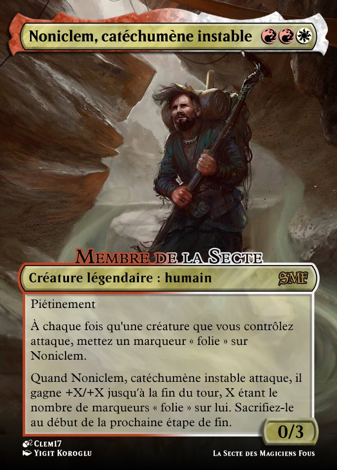 Donc vous avez ici mon avatar pour la Secte, qui ne joue pas avec la Disparition mais garde quand même le côté éphémère qu'on a donné au rouge-blanc dans le set. C'est aussi un très bon producteur de marqueurs folie, très amusant dans une stratégie go-wide. Si on le protégeait, on pourrait même imaginer en Commander d'avoir des armées de 1/1 et de tuer un adversaire aux blessures de commandant en un tour.