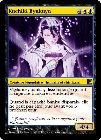 Cette carte me conforte dans l'idée que, alors que ces Shinigami ont un niveau de Capitaine, et des techniques très différentes dans le manga, ton interprétation ne rend pas vraiment hommage à ces différences, puisque ils ont tous un Bankaï identique (même si la durée peut changer un peu) et ne se distinguent que par de petites capas (Vigilance pour Byakuya, Convocation pour Toushiro...).