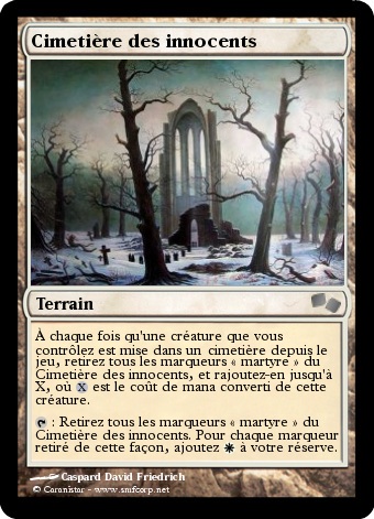 A chaque fois qu'une créature que vous contrôlez est mise dans un cimetieère depuis le jeu, retirez tous les marqueurs "martyrs" du Cimetière des innocents. Mettez ensuite jusqu'à X marqueurs martyrs sur le Cimetière des innocents où X est le coût de mana converti de cette créature.