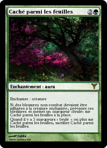 La capa: en fait, la créature est cachée, donc on ne peut lui infliger des blessures que quand elle sort (un combat) puisqu'on ne la voit pas. J'aurais pu lui donner le linceul, mais ça faisait beaucoup plus bleu à ce moment-là. Donc voilà le résultat : c'est bien beau d'être planqué, mais ce ne sont que des fleurs et des feuilles, ce n'est pas très solide. Donc ça brûle (d'accord, tous les dégâts non-combat ne sont pas dû au feu, mais je ne voyais pas d'autre nom de marqueur). Et quand c'est bien brûlé, ben la créa n'est plus protégée. Au passage,puisqu'on parle de nom de marqueurs, je sais que j'aurais dû mettre un espace sans les parenthèses la première fois que j'ai écris "brûlé", mais ça cassais le mise en page du texte. Un petit mal pour en éviter un plus gros, donc.