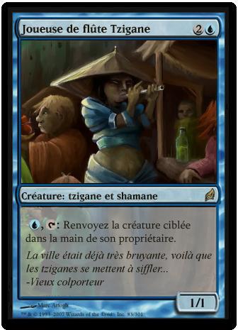 Le dessin de la joueuse de flute ne montre pas vraiment une tzigane, plutôt une "chinoise". Elle pourrait à la rigueur passer pour une "Sangami" issue de Shadowmoor/Eventide. Le type Tzigane ne fait pas vraiment Magic, et "Sangami et Shamane" aurait eu ma préférence.