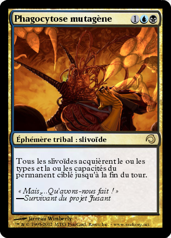 J'aurais plutôt vu une telle carte en blanc-bleu, c'est la couleur des protections par excellence ^^ l'intérêt de l'effet me laisse un peu perplexe: les slivoïdes deviennent une copie de la créature ciblée: si t'as 8 slivoïde musclé, ok là c'est très fort ^^ mais si tu copies un permanent non slivoïde, l'effet ne se propage pas dans l'essaim! ... Non en fait c'est pas mal comme ça ^^ sinon ça serait très voir trop fort pour son coût avec certains effets.