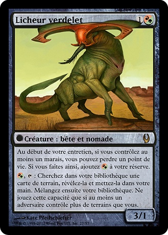 C'est une créature qui, avant, vivait dans une terre d'abondance, où les déplacements étaient inutiles tellement la nourriture pullulait. Mais peu après un terrible accident (ou une machination de Liliana Vess pour retrouver un de ses Démons ?) qui assécha son plan d'origine, les meutes de licheurs durent se séparer et quitter la vie sédentaire pour rechercher le peu de verdure qu'il restât. N'étant pas les seules races à faire ainsi, elles sont entrées dans la concurrence et se doivent donc sortir du lot. Le fait que, dès qu'un individu trouve une source où vivre pendant quelques heures, cet individu produit du mana purement sauvage qui attire les êtres vivants, mais qui les blessent momentanément, est un véritable atout pour survivre. Elles se servent d'ailleurs de ce don pour se nourrir des pauvres proies attirées, faisant de ces créatures les bêtes les plus vils et fourbes de leur plan. N'ayant plus aucune considération pour la vie, elles voyagent à présent pour libérer ce flux de mana, et ainsi attirer leurs nourritures, quitte à se suicider à cause de l'énergie dégagée.