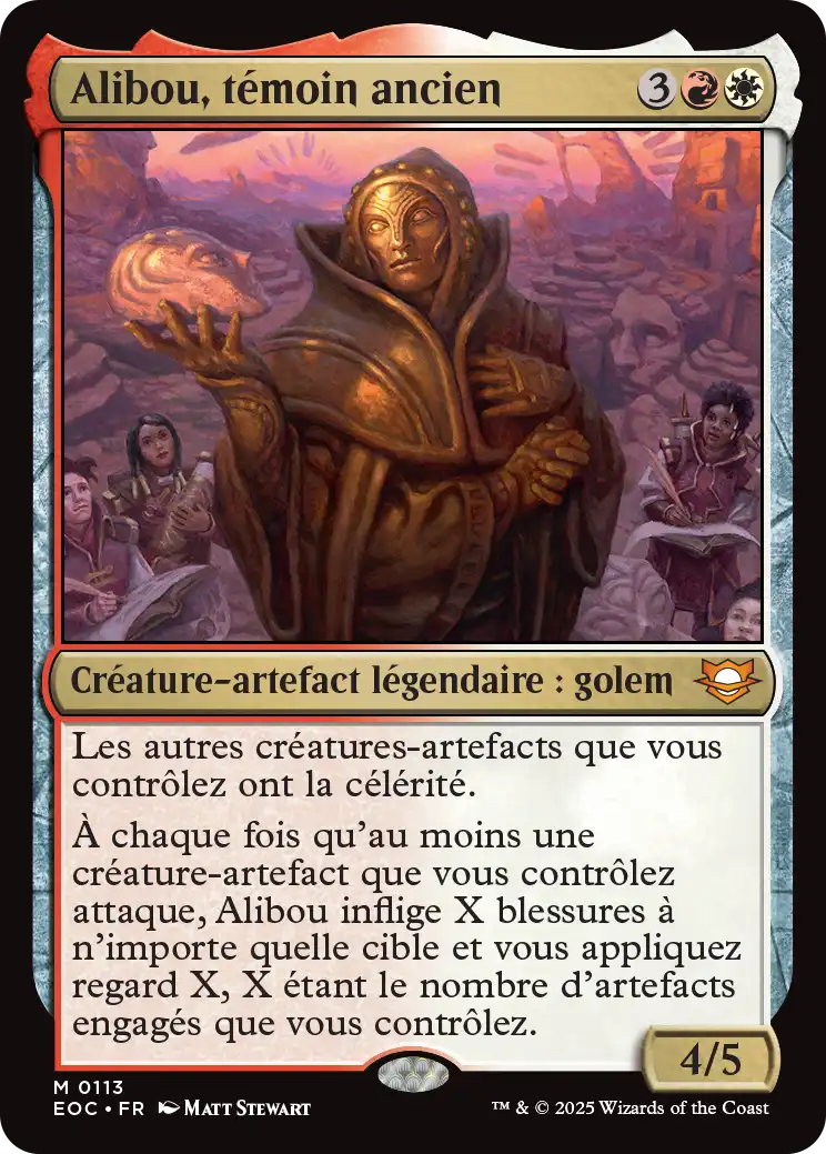 À chaque fois qu'au moins une créature-artefact que vous contrôlez attaque, Alibou, témoin ancien inflige X blessures à n'importe quelle cible et vous appliquez regard X, X étant le nombre d'artefacts engagés que vous contrôlez.