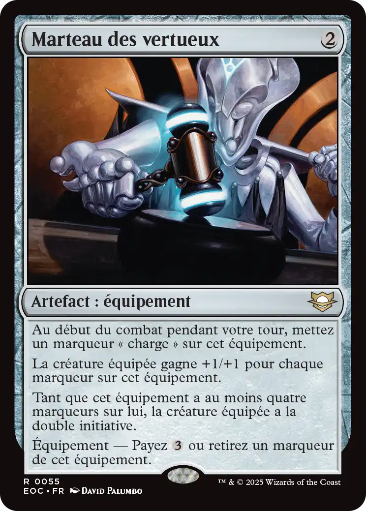 La créature équipée gagne +1/+1 pour chaque marqueur sur le Marteau des vertueux.