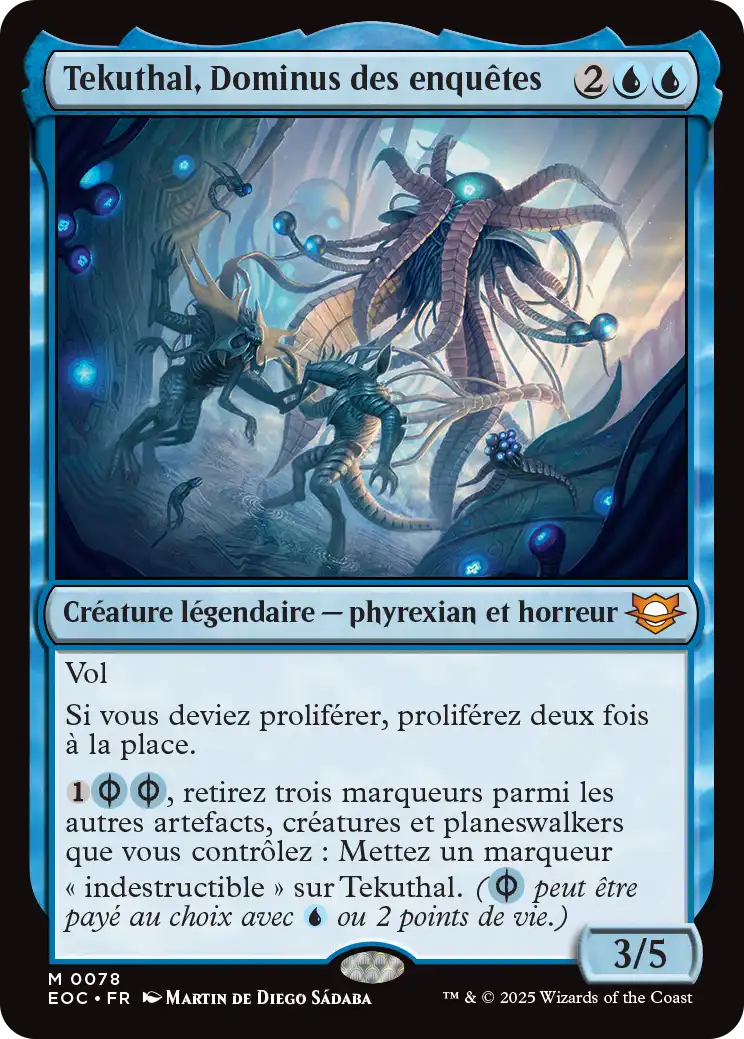 {U/P}{U/P}, retirez trois marqueurs parmi les autres artefacts, créatures et planeswalkers que vous contrôlez : Mettez un marqueur « indestructible » sur Tekuthal, Dominus des enquêtes.