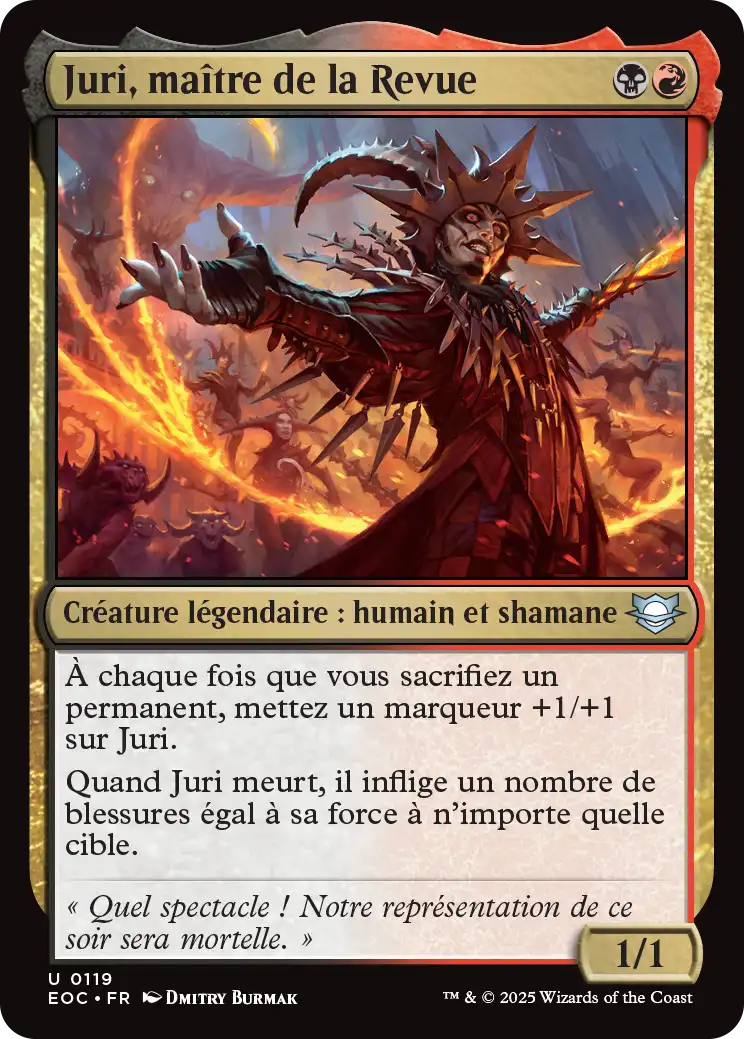 À chaque fois que vous sacrifiez un permanent, mettez un marqueur +1/+1 sur Juri, maître de la Revue.