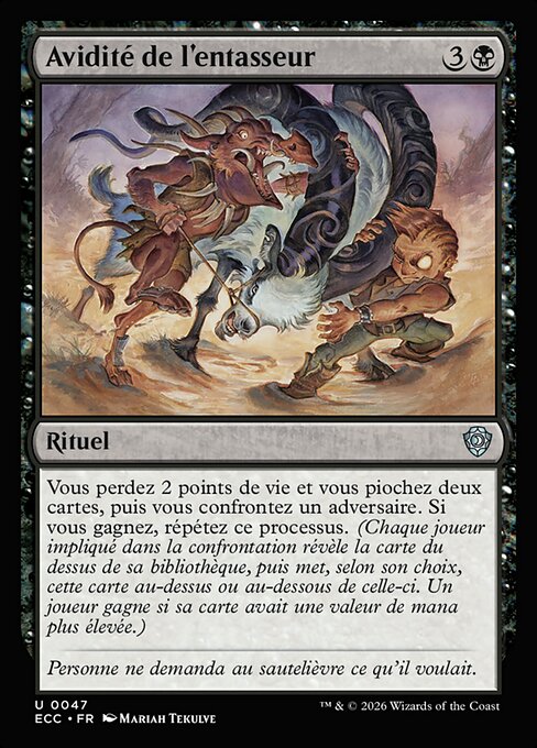 Vous perdez 2 points de vie et vous piochez deux cartes, puis vous confrontez un adversaire. Si vous gagnez, répétez ce processus. (Chaque joueur impliqué dans la confrontation révèle la carte du dessus de sa bibliothèque et met ensuite cette carte au-dessus ou au-dessous de celle-ci. Un joueur gagne si sa carte a une valeur de mana plus élevée.)