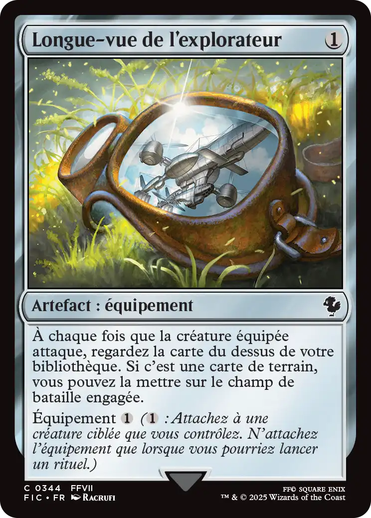 À chaque fois que la créature équipée attaque, regardez la carte du dessus de votre bibliothèque. Si c'est une carte de terrain, vous pouvez la mettre sur le champ de bataille engagée.