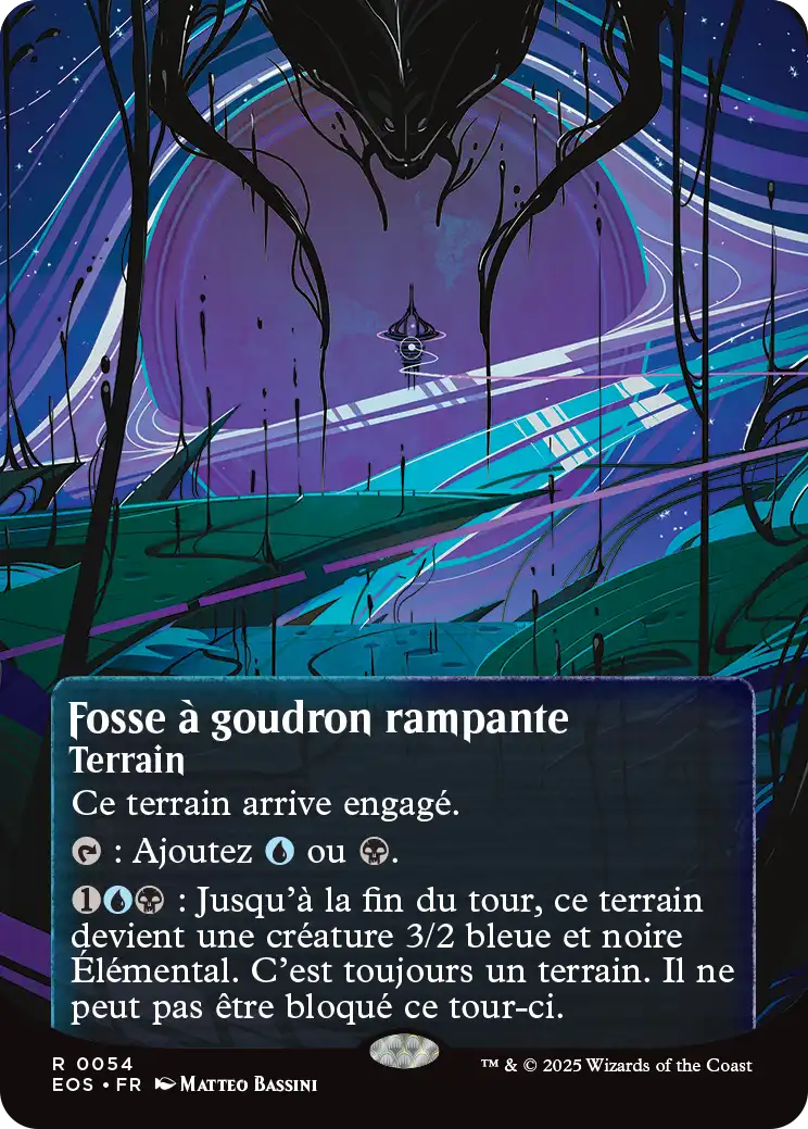 : La Fosse à goudron rampante devient une créature 3/2 bleue et noire Élémental jusqu'à la fin du tour et elle ne peut pas être bloquée ce tour-ci. C'est toujours un terrain.