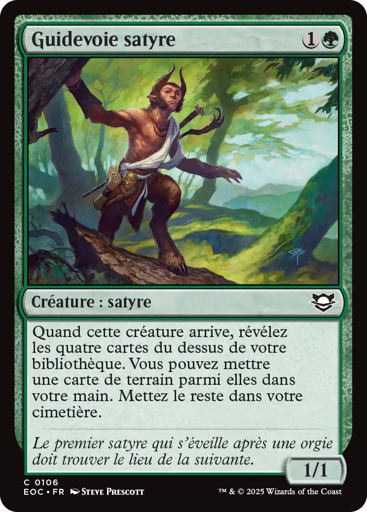 Quand le Guidevoie satyre arrive sur le champ de bataille, révélez les quatre cartes du dessus de votre bibliothèque. Vous pouvez mettre une carte de terrain parmi elles dans votre main. Mettez le reste dans votre cimetière.