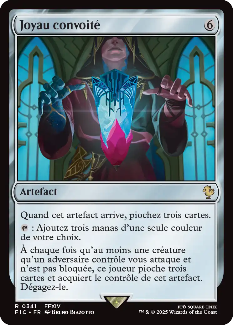 : Ajoutez trois manas d'une seule couleur de votre choix. À chaque fois qu'au moins une créature qu'un adversaire contrôle vous attaque et n'est pas bloquée, ce joueur pioche trois cartes et acquiert le contrôle du Joyau convoité. Dégagez-le.