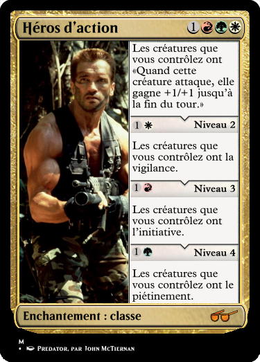 Pour moi, Schwarzi joue {W}{G}{R}. {W} pour l'héroïsme, {G} pour la force, {R} pour la bourinitude. Les trois piliers du cinéma hollywoodien. Les quatre cartes suivantes font référence à ses fi...