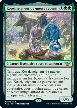 Tant que Kosei, seigneur de guerre repenti est enchanté, équipé, et a un marqueur sur lui, Kosei a « À chaque fois que Kosei, seigneur de guerre repenti inflige des blessures de combat à un adversaire, vous piochez autant de cartes et Kosei inflige autant de blessures à chaque autre adversaire. »