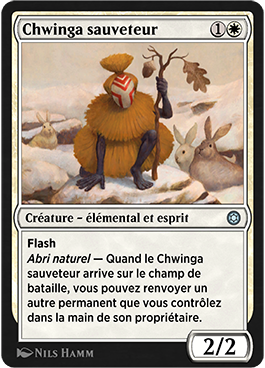 Abri naturel — Quand le Chwinga sauveteur arrive sur le champ de bataille, vous pouvez renvoyer un autre permanent que vous contrôlez dans la main de son propriétaire.