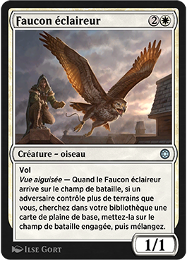 Vue aiguisée — Quand le Faucon éclaireur arrive sur le champ de bataille, si un adversaire contrôle plus de terrains que vous, cherchez dans votre bibliothèque une carte de plaine de base, mettez-la sur le champ de bataille engagée, puis mélangez.