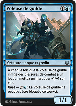 À chaque fois que la Voleuse de guilde inflige des blessures de combat à un joueur, mettez un marqueur +1/+1 sur elle.