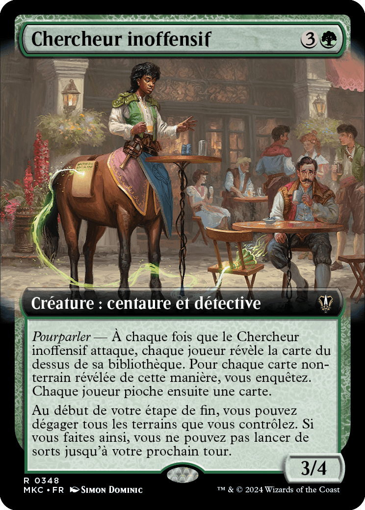 Pourparler — À chaque fois que le Chercheur inoffensif attaque, chaque joueur révèle la carte du dessus de sa bibliothèque. Pour chaque carte non-terrain révélée de cette manière, vous enquêtez. Chaque joueur pioche ensuite une carte.