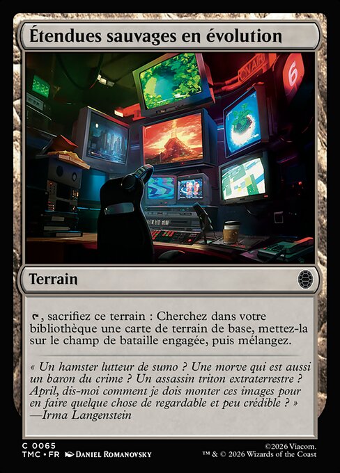 , sacrifiez les Étendues sauvages en évolution : Cherchez dans votre bibliothèque une carte de terrain de base, mettez-la sur le champ de bataille engagée, puis mélangez.