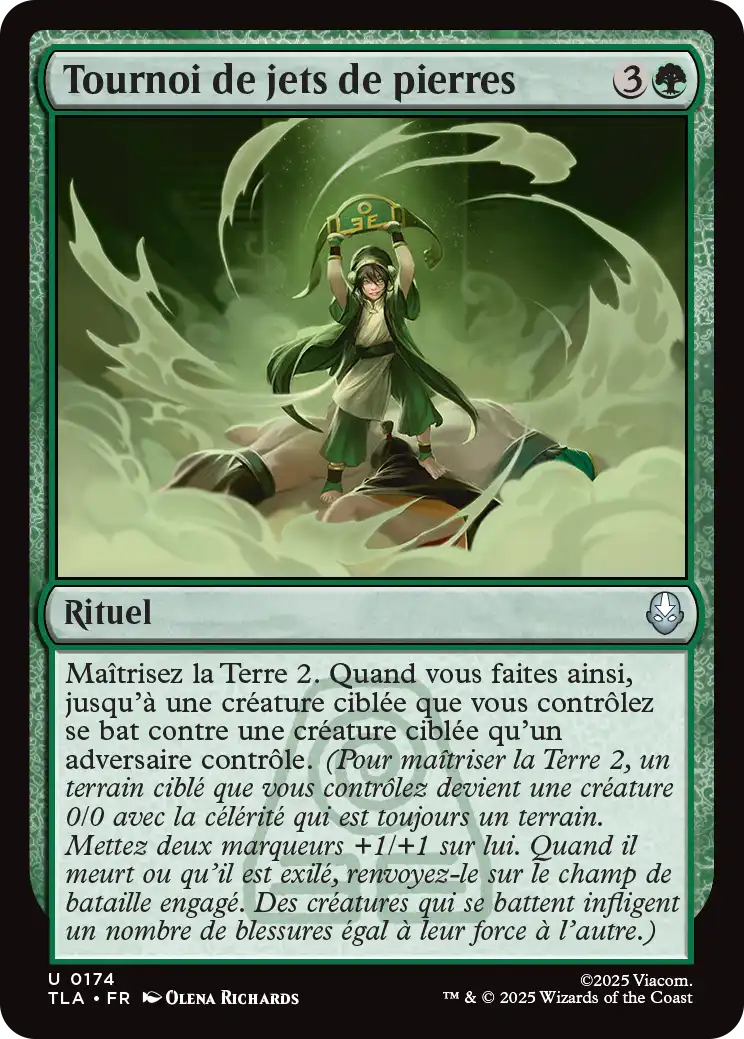 Maîtrisez la Terre 2 qui est toujours un terrain. Mettez deux marqueurs +1/+1 sur lui. Quand il meurt ou qu'il est exilé, renvoyez-le sur le champ de bataille engagé.). Quand vous faites ainsi, jusqu'à une créature ciblée que vous contrôlez se bat (Chacune inflige autant de blessures que sa force à l'autre.) contre une créature ciblée qu'un adversaire contrôle.