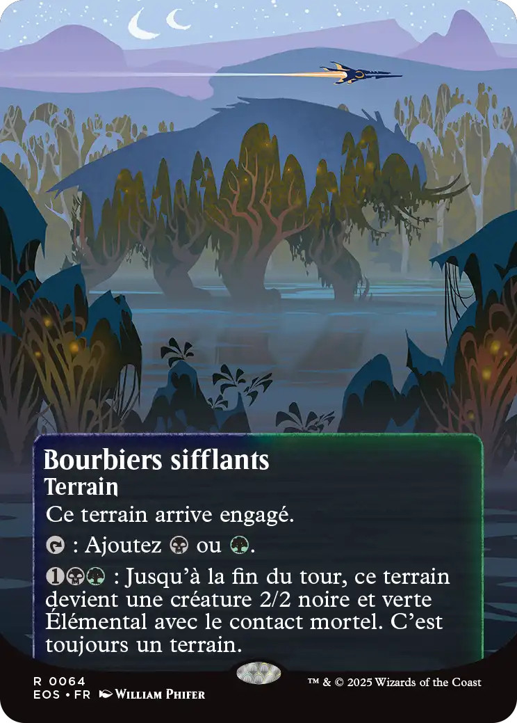 : Les Bourbiers sifflants deviennent une créature 2/2 noire et verte Élémental avec le contact mortel jusqu'à la fin du tour. C'est toujours un terrain.