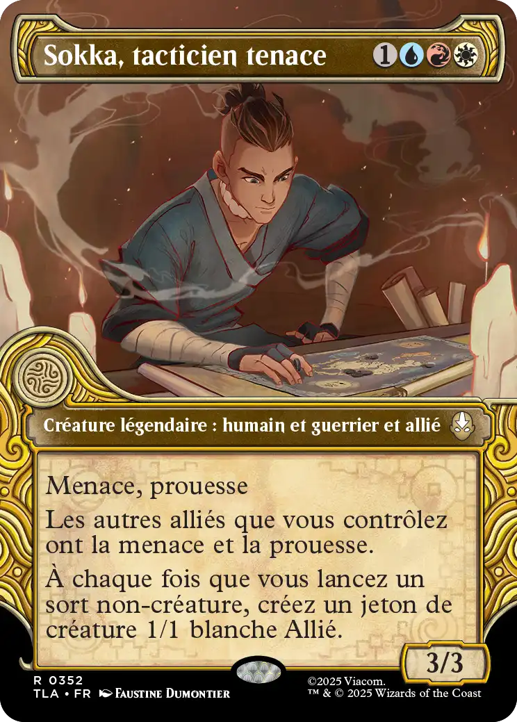 Les autres alliés que vous contrôlez ont la menace (Cette créature ne peut pas être bloquée excepté par deux créatures ou plus.) et la prouesse (À chaque fois que vous lancez un sort non-créature, cette créature gagne +1/+1 jusqu'à la fin du tour.).