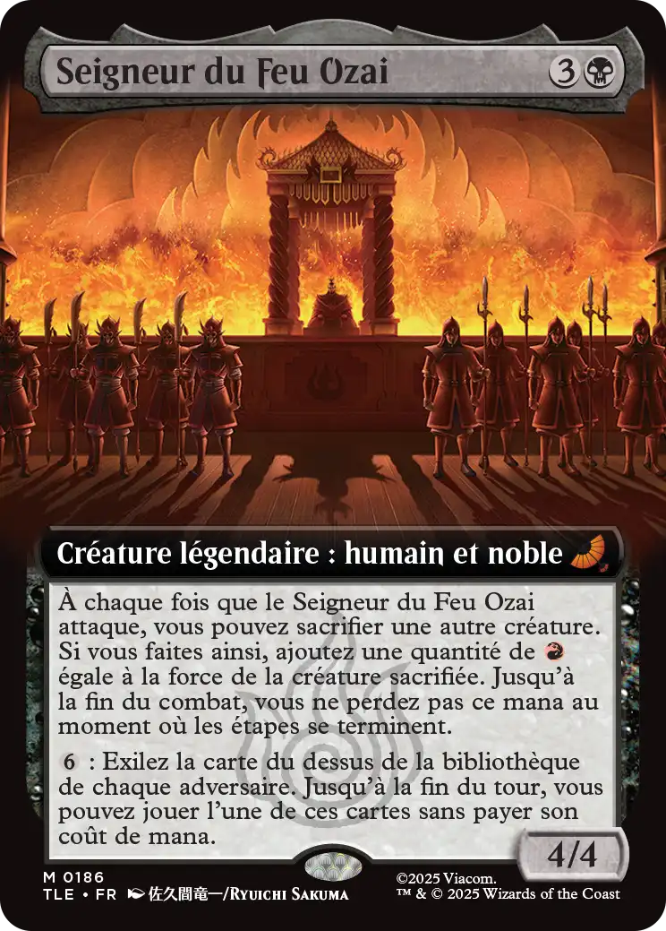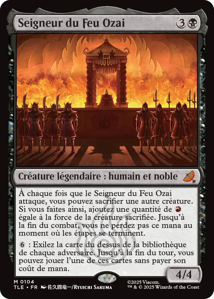 A chaque fois que le Seigneur du Feu Ozai attaque, vous pouvez sacrifier une autre créature. Si vous faites ainsi, ajoutez une quantité de