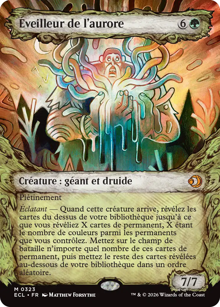 Éclatant - Quand cette créature arrive, révélez les cartes du dessus de votre bibliothèque jusqu'à ce que vous révéliez X cartes de permanent, X étant le nombre de couleurs parmi les permanents que vous contrôlez. Mettez sur le champ de bataille n'importe quel nombre de ces cartes de permanent, puis mettez le reste des cartes révélées au-dessous de votre bibliothèque dans un ordre aléatoire.