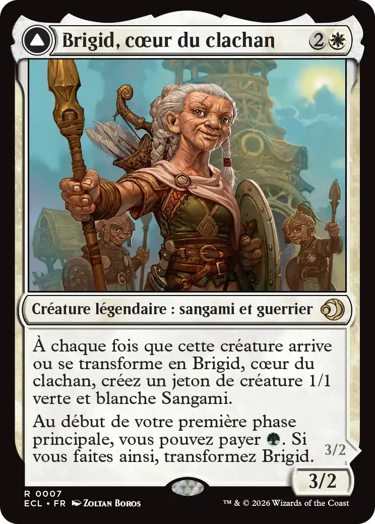 À chaque fois que cette créature arrive ou se transforme en Brigid, cur du clachan, créez un jeton de créature 1/1 verte et blanche Sangami.