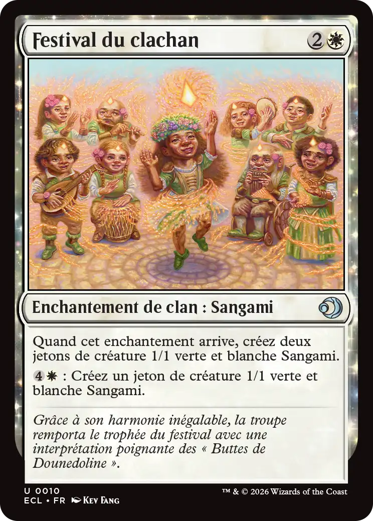 Quand cet enchantement arrive, créez deux jetons de créature 1/1 verte et blanche Sangami.
