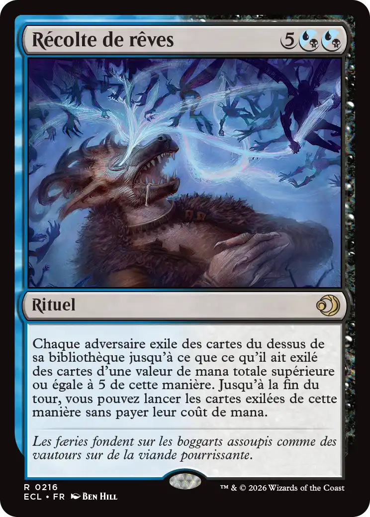 Chaque adversaire exile des cartes du dessus de sa bibliothèque jusqu'à ce que ce qu'il ait exilé des cartes d'une valeur de mana totale supérieure ou égale à 5 de cette manière. Jusqu'à la fin du tour, vous pouvez lancer les cartes exilées de cette manière sans payer leur coût de mana.